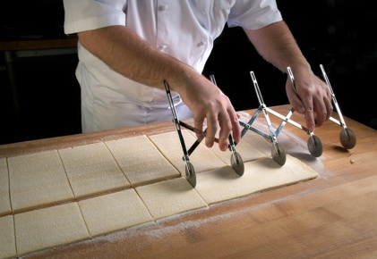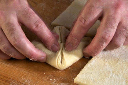 The basic techniques for lamination are used however the butter block will be thicker than for croissant and the second and third folds have the addition of sugar. It is important to use butter that is soft and pliable, yet not so soft that it will absorb into the dough. The first single fold should be done normal as for croissant. If using a dough sheeter, the second fold should be done right away, if processing by hand, allow the dough to rest 30 minutes in the refrigerator. Once the dough is sheeted out for the second fold, apply a third of the sugar for lamination over the surface of the dough. Next, give the dough a single fold and reserve in the freezer for thirty minutes. The third fold is done exactly the same as the second: once sheeted out, apply a third of the sugar for lamination over the dough and fold the dough in thirds. Again, reserve the dough in the freezer for thirty minutes. Allowing the dough to relax longer or in the refrigerator may cause the sugar to become liquid, which renders the project very difficult.
