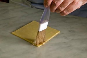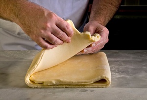 The timing of the first few folds of inverted puff pastry is important. Before beginning the lamination process, the proper temperature and texture of the paton must be achieved to ensure ease of production. The butter in the beurrage needs to be cold, yet pliable. If it is too cold it will crack during lamination and if it is too soft it will absorb into the dough and be difficult to roll out evenly. The process for lamination is the same as for classic puff pastry. Five to six single folds is standard and two folds can be done back to back when using a dough sheeter (see below). Like classic or blitz puff, inverted puff should be kept cold in the refrigerator between sets of folds.
