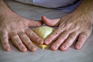 In the case of inverted puff pastry, the détrempe is enclosed in the beurrage. The beurrage should be twice the size of the détrempe so that it can easily wrap around it. The beurrage may need to be softened slightly in order to wrap it around the détrempe and ensure that it is extensible during sheeting. Once this step is complete, we have the paton (see below). By using sufficient dusting flour, the paton will not be too sticky. If the outside of the paton becomes too soft, place it in the refrigerator for a few minutes.