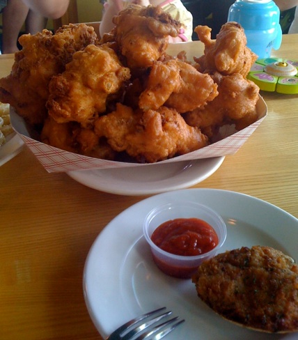 The clam cakes from A.C. are legendary and the best I have ever had. Only eat a few though... as they are loaded. In the foreground, another stuffie served with some cocktail sauce. Very good as well.