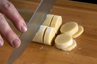 Slice the log into the cookies. Be careful to slice evenly so the cookies all bake at the same rate. Also, the cookies will look so much nicer if they are all the same size.