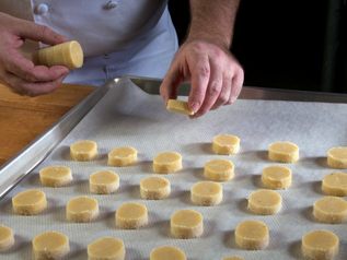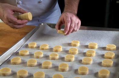 Diamond cookies are typically a round disc shape. In order to achieve this shape the dough is portioned by weight, rolled into logs and reserved in the refrigerator or freezer until needed. If well wrapped, unbaked dough has a shelf-life in the freezer for several weeks. The dough can be stored for several days in the refrigerator. As needed the dough is finished by lightly brushing with egg, dredging in granulated sugar and then cutting into individual portions. (See figures 2, 3 and 4). This last step should be done just before baking to ensure the sugar does not dissolve (in the refrigerator). The cookies are baked at a moderate temperature (300-325F) to ensure they bake through, yet don’t take on much color. Once baked and cool, the cookies are good for several days or longer if packaged for sale in plastic.